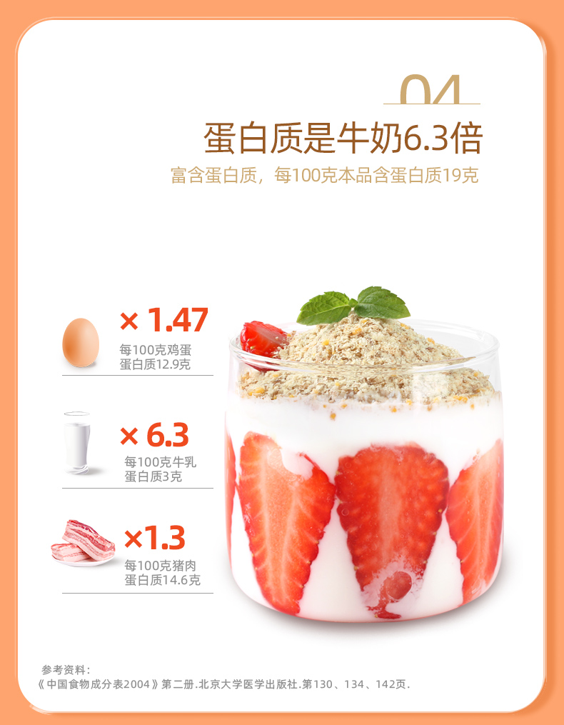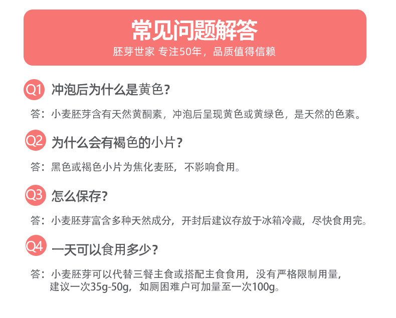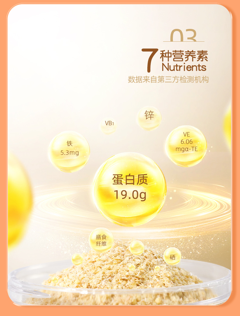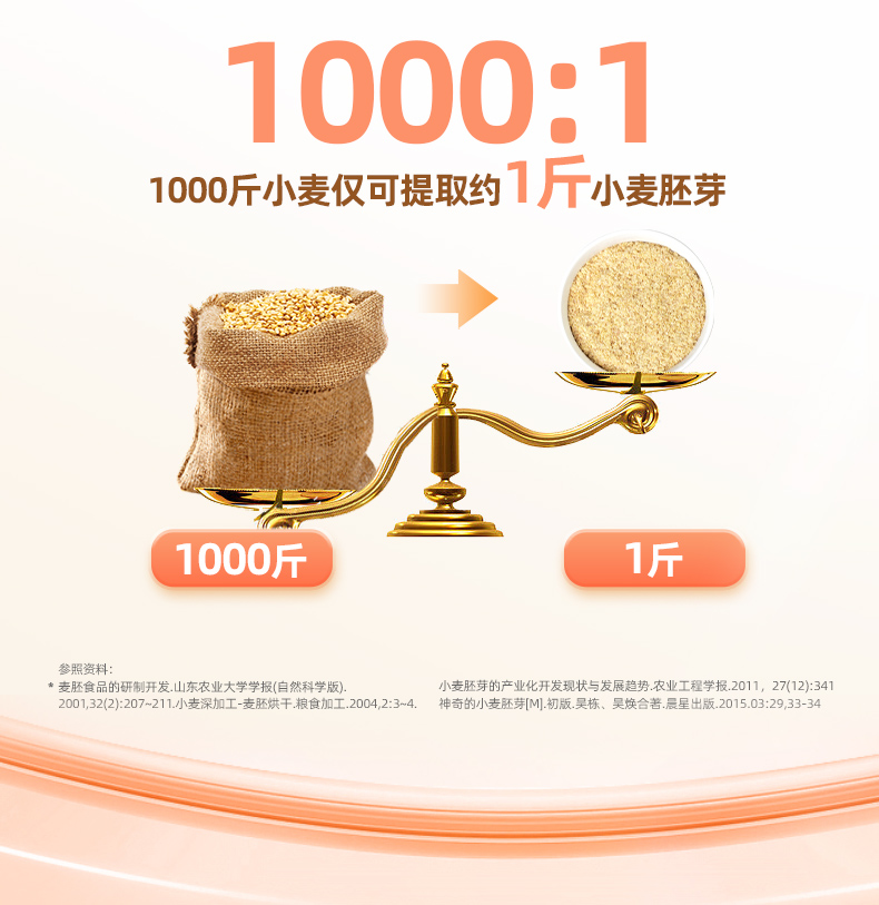 ★ 小麦胚芽 不是麦片,是“植物燕窝” ★ 1000斤优质小麦仅可提取约1斤小麦胚芽 ★ 蛋白质≥28% 约是牛奶的9倍 ★ 维生素E 约是大米的7倍 ★ 膳食纤维 约是大米的3倍 ★ 铁 约是小麦粉的8倍 ★ 锌 约是小麦粉的13倍