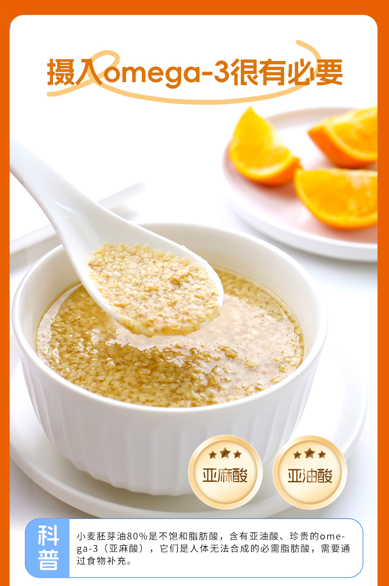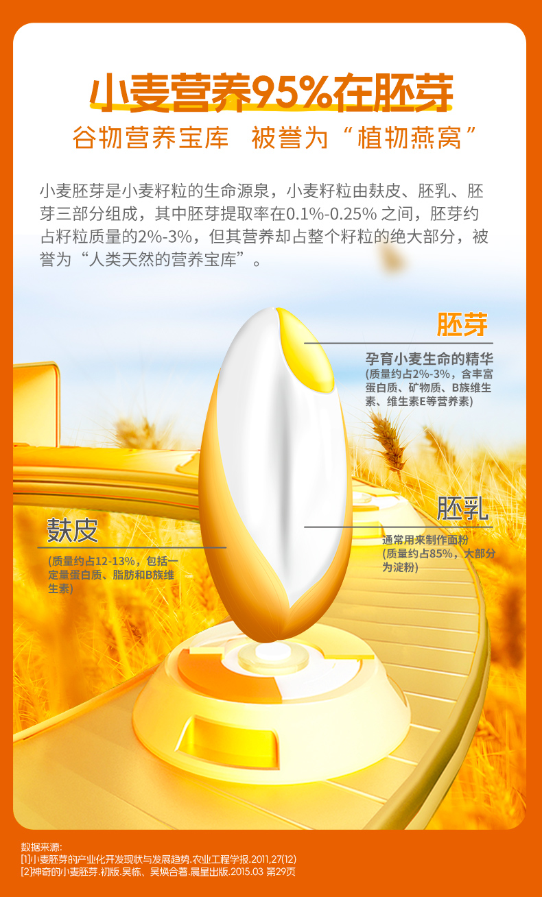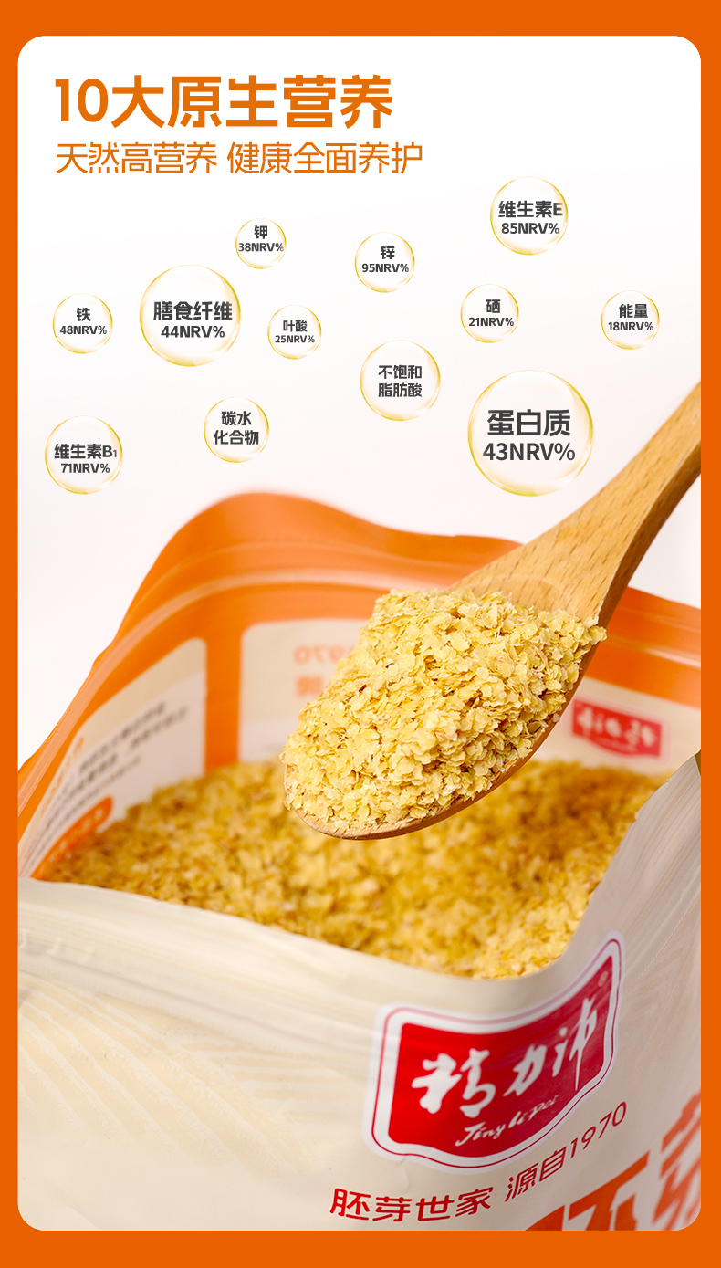 ★ 1000斤优质小麦仅可提取约1斤小麦胚芽 ★ 加拿大进口小麦 (非转基因)提取小麦胚芽 ★ 蛋白质≈26% 约是牛奶的8倍 ★ 维生素B6 约是燕麦的2倍 ★ 维生素E 约是燕麦的4倍 ★ 锌 约是燕麦的4倍