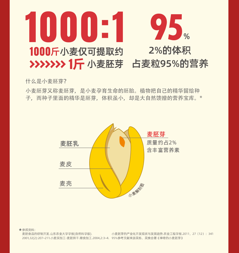 ★ 小麦胚芽 不是麦片,是“植物燕窝” ★ 1000斤优质小麦仅可提取约1斤小麦胚芽 ★ 蛋白质≥26% 约是牛奶的9倍 ★ 维生素E 约是大米的7倍 ★ 膳食纤维 约是大米的3倍 ★ 铁 约是小麦粉的8倍 ★ 锌 约是小麦粉的13倍 ★ 硒 约是燕麦的5倍