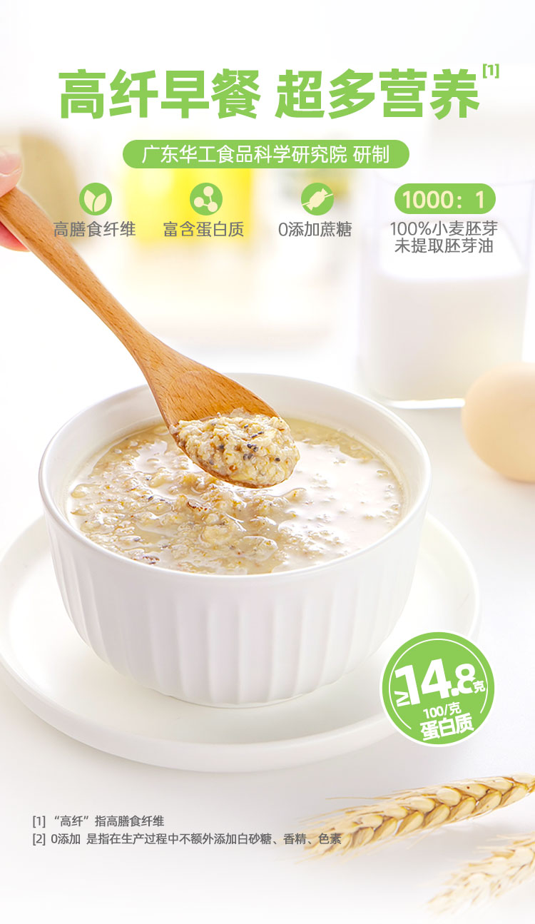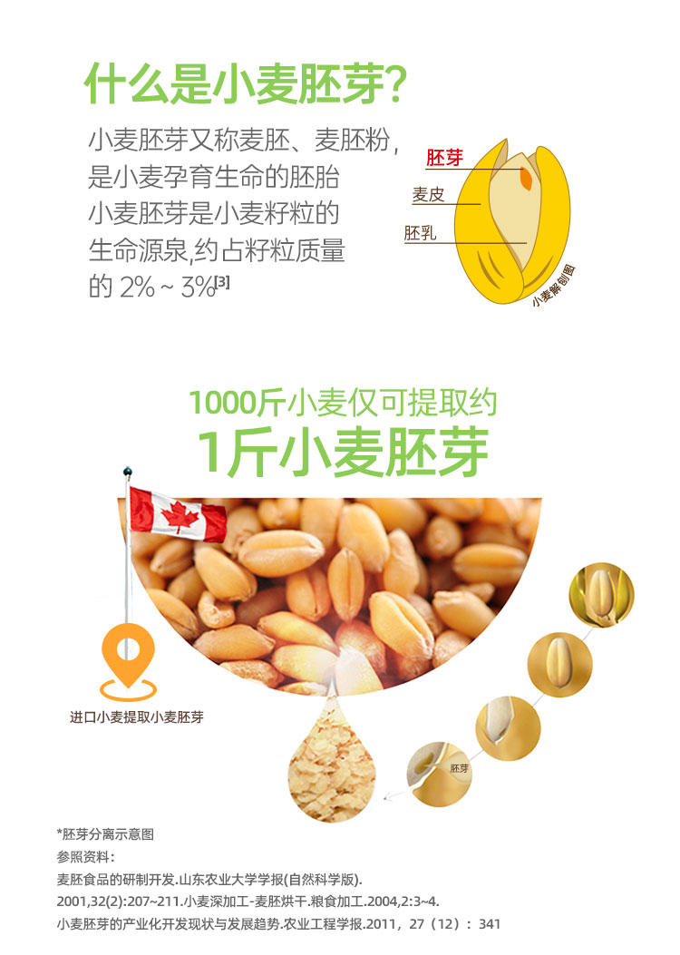 ★ 1000斤优质小麦仅可提取约1斤小麦胚芽 ★ 加拿大进口小麦 (非转基因)提取小麦胚芽 ★ 蛋白质≥30% 约是牛奶的10倍 ★ 富硒 NRV%≥80% 约是燕麦的9倍 ★ 维生素B6 约是燕麦的2倍 ★ 维生素E 约是燕麦的4倍 ★ 锌 约是燕麦的4倍 ★ 0添加蔗糖,100%未提取小麦胚芽油