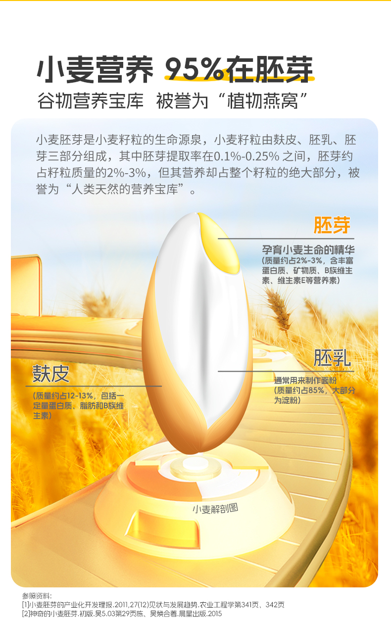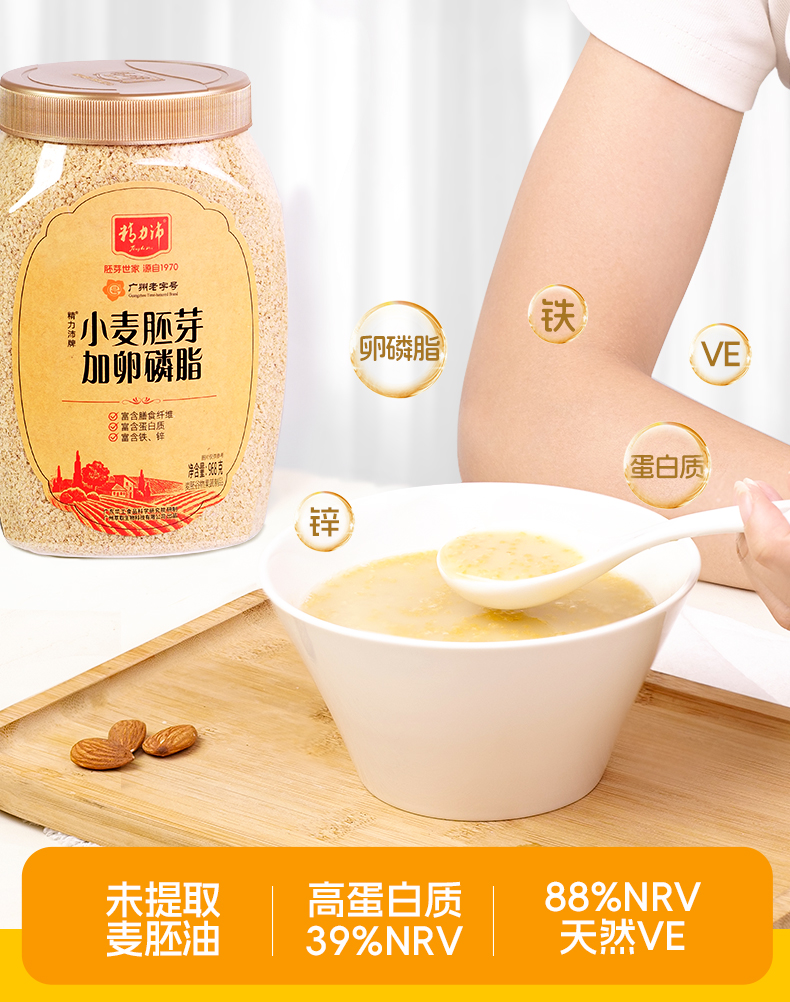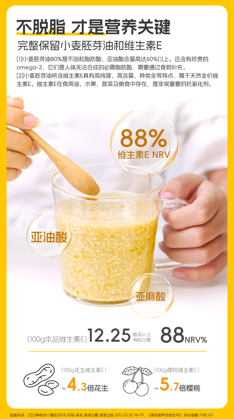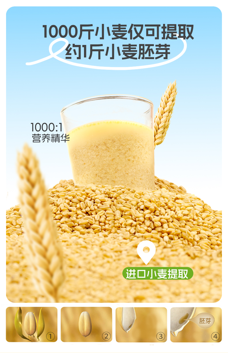 ★ 1000斤优质小麦仅可提取约1斤小麦胚芽 ★ 加拿大进口小麦 (非转基因)提取小麦胚芽 ★ 蛋白质≥30% 约是牛奶的10倍 ★ 富硒 NRV%≥80% 约是燕麦的9倍 ★ 维生素B6 约是燕麦的2倍 ★ 维生素E 约是燕麦的4倍 ★ 锌 约是燕麦的4倍 ★ 增加卵磷脂