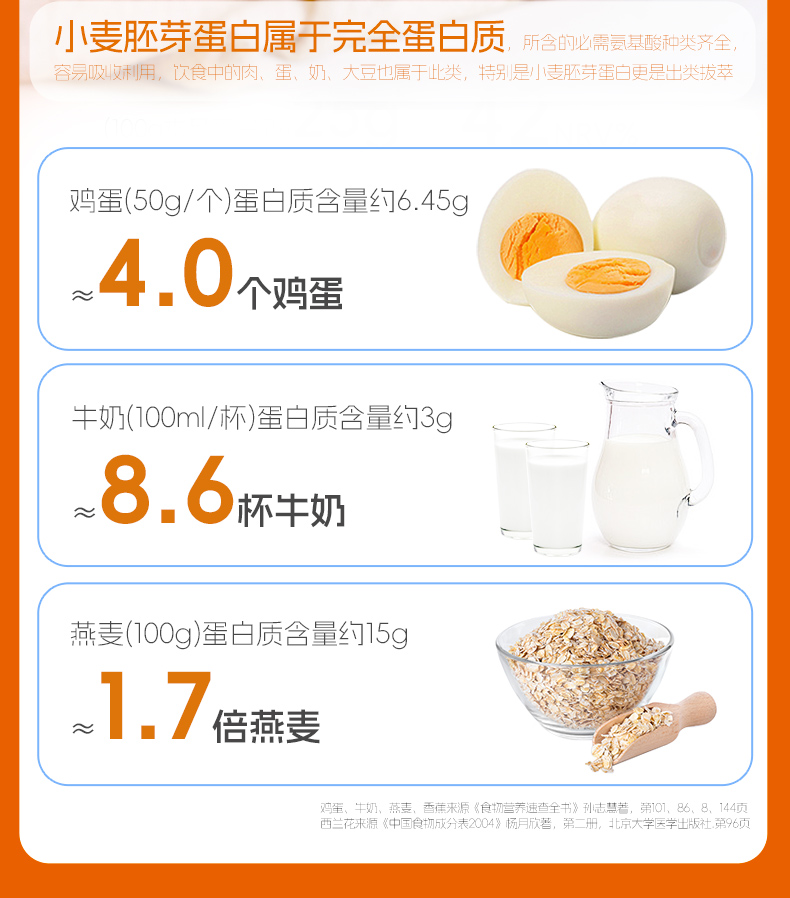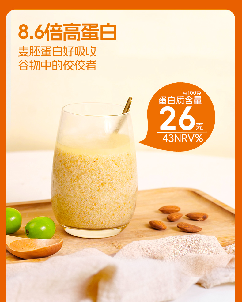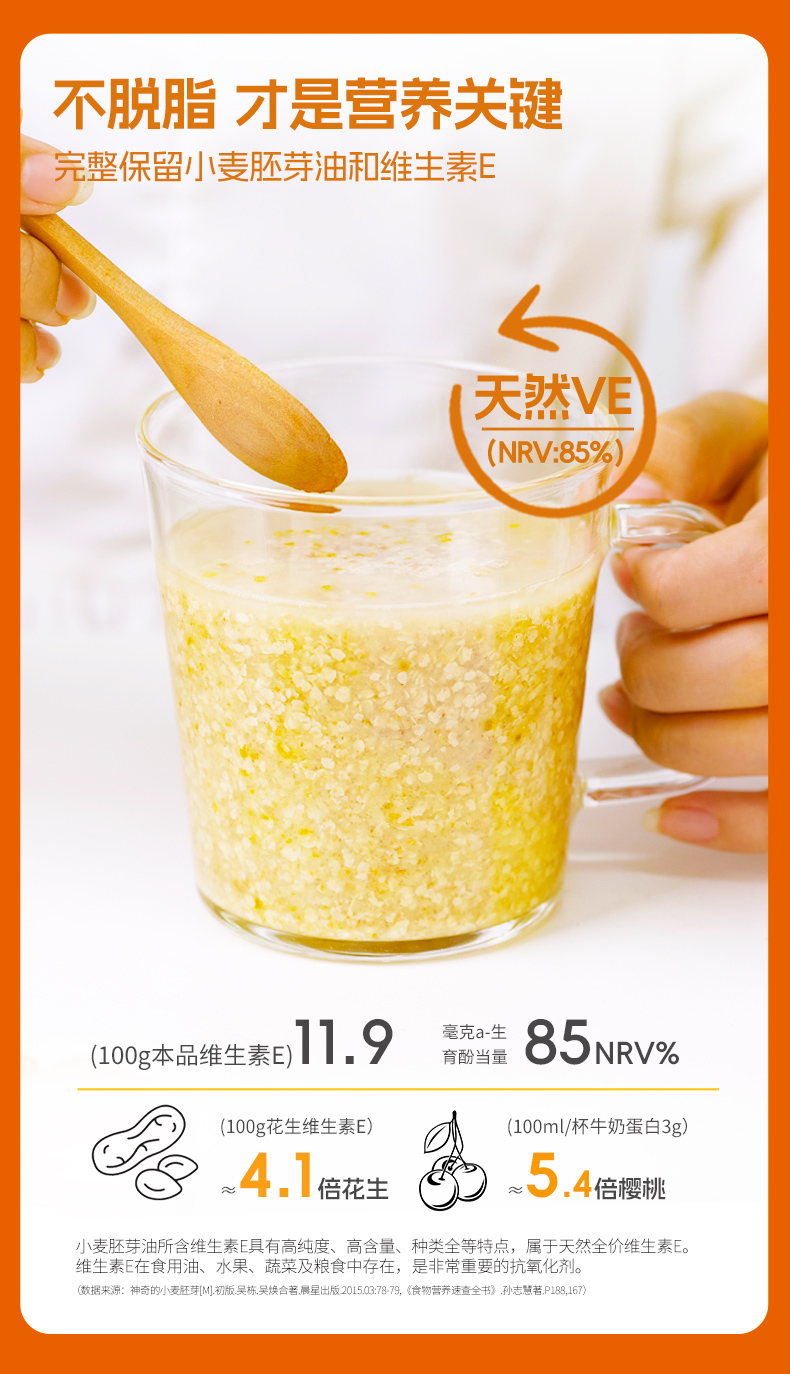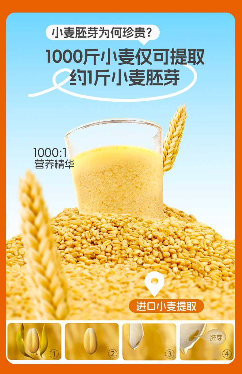 ★ 1000斤优质小麦仅可提取约1斤小麦胚芽 ★ 加拿大进口小麦 (非转基因)提取小麦胚芽 ★ 蛋白质≈26% 约是牛奶的8倍 ★ 维生素B6 约是燕麦的2倍 ★ 维生素E 约是燕麦的4倍 ★ 锌 约是燕麦的4倍