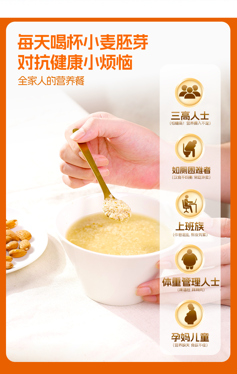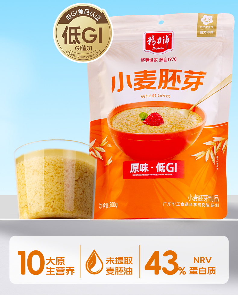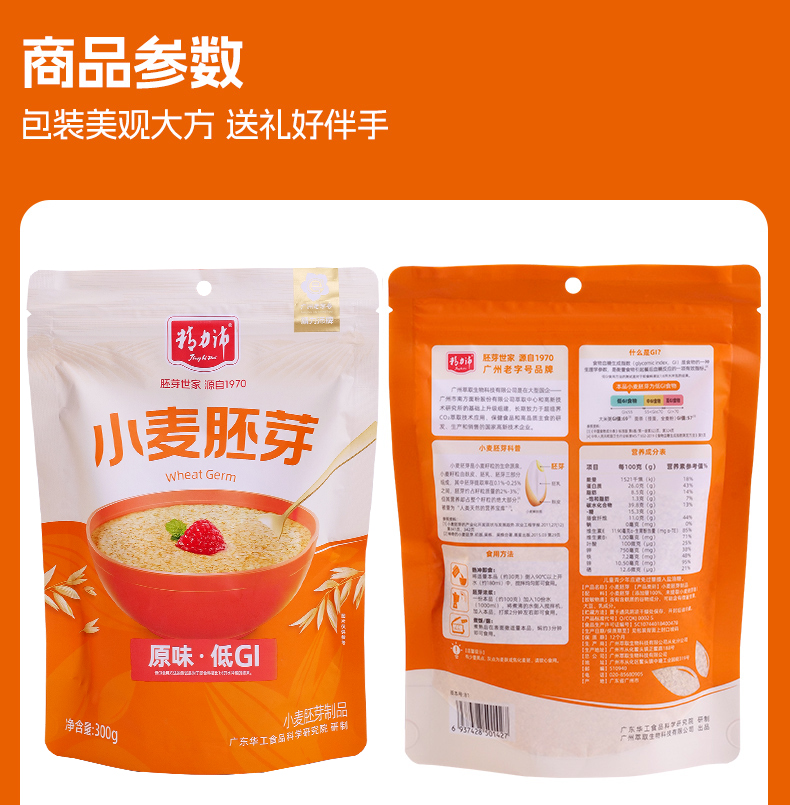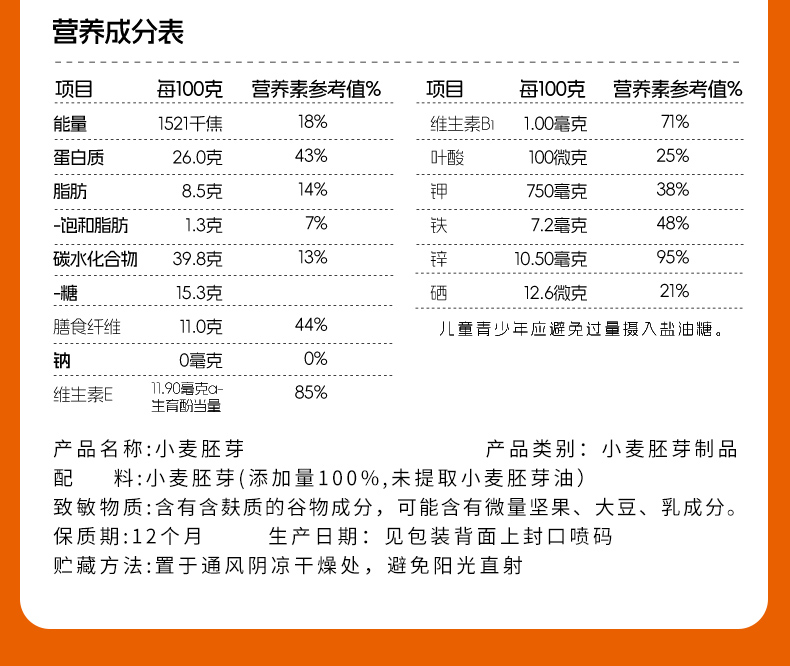 ★ 1000斤优质小麦仅可提取约1斤小麦胚芽 ★ 加拿大进口小麦 (非转基因)提取小麦胚芽 ★ 蛋白质≈26% 约是牛奶的8倍 ★ 维生素B6 约是燕麦的2倍 ★ 维生素E 约是燕麦的4倍 ★ 锌 约是燕麦的4倍