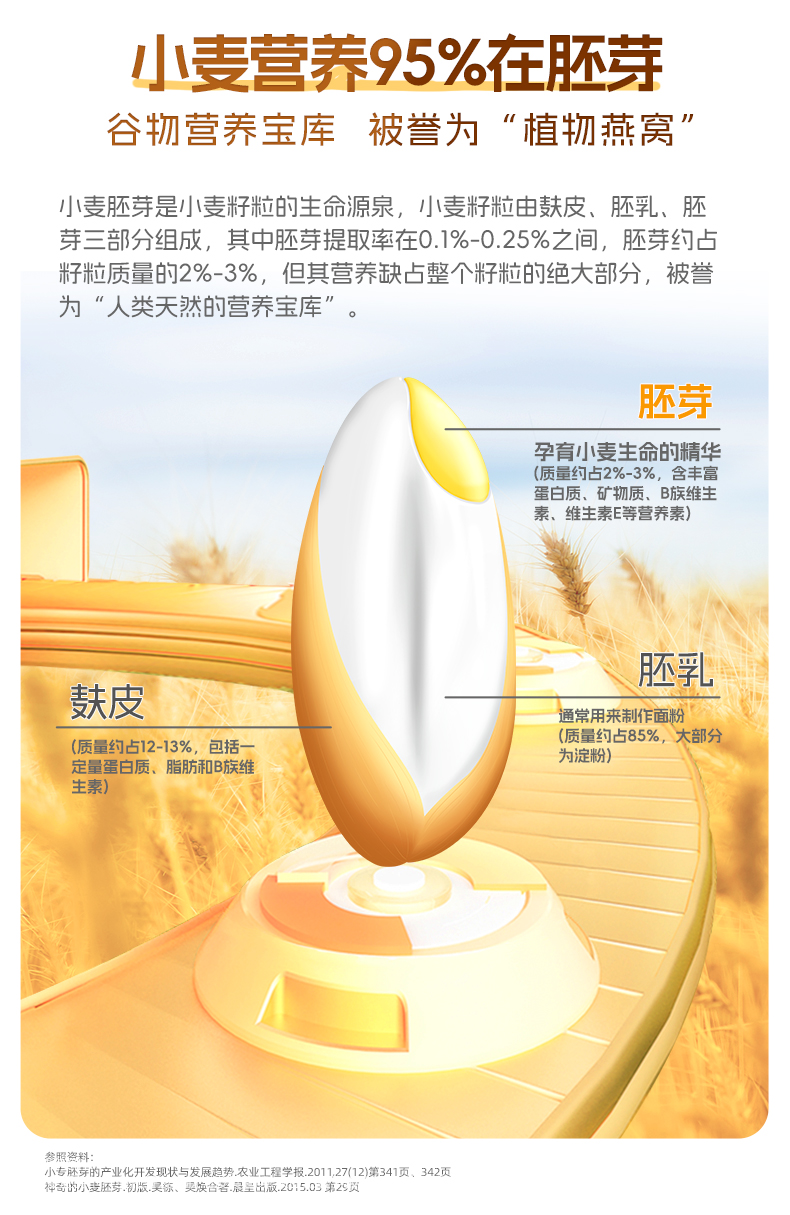 ★ 1000斤优质小麦仅可提取约1斤小麦胚芽 ★ 加拿大进口小麦 (非转基因)提取小麦胚芽 ★ 蛋白质≥30% 约是牛奶的10倍 ★ 富硒 NRV%≥80% 约是燕麦的9倍 ★ 添加青稞、藜麦