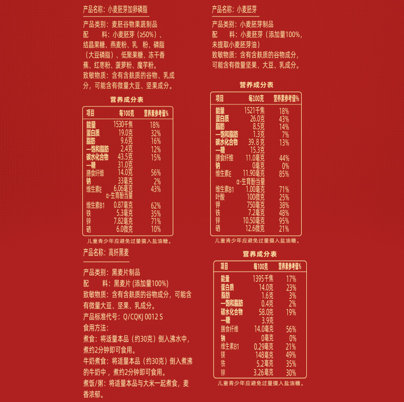 ★ 小麦胚芽 不是麦片,是“植物燕窝” ★ 1000斤优质小麦仅可提取约1斤小麦胚芽 ★ 蛋白质≥26% 约是牛奶的9倍 ★ 维生素E 约是大米的7倍 ★ 膳食纤维 约是大米的3倍 ★ 铁 约是小麦粉的8倍 ★ 锌 约是小麦粉的13倍 ★ 硒 约是燕麦的5倍